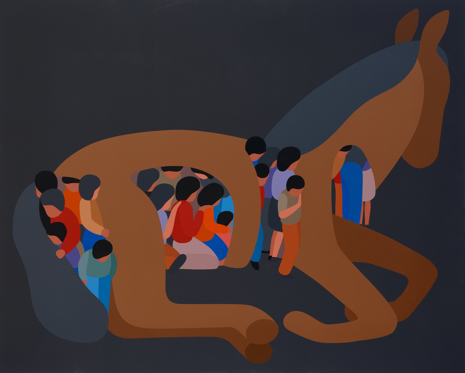 Outside Experience presents a quiet meditation on refuge and connection. The figures nestle not in architecture but within the body of an animal; offering shelter that is ancient, soft, and breathing. These forms are metaphors for memory, instinct, and belonging, reminding us how to be still and held by something greater.
